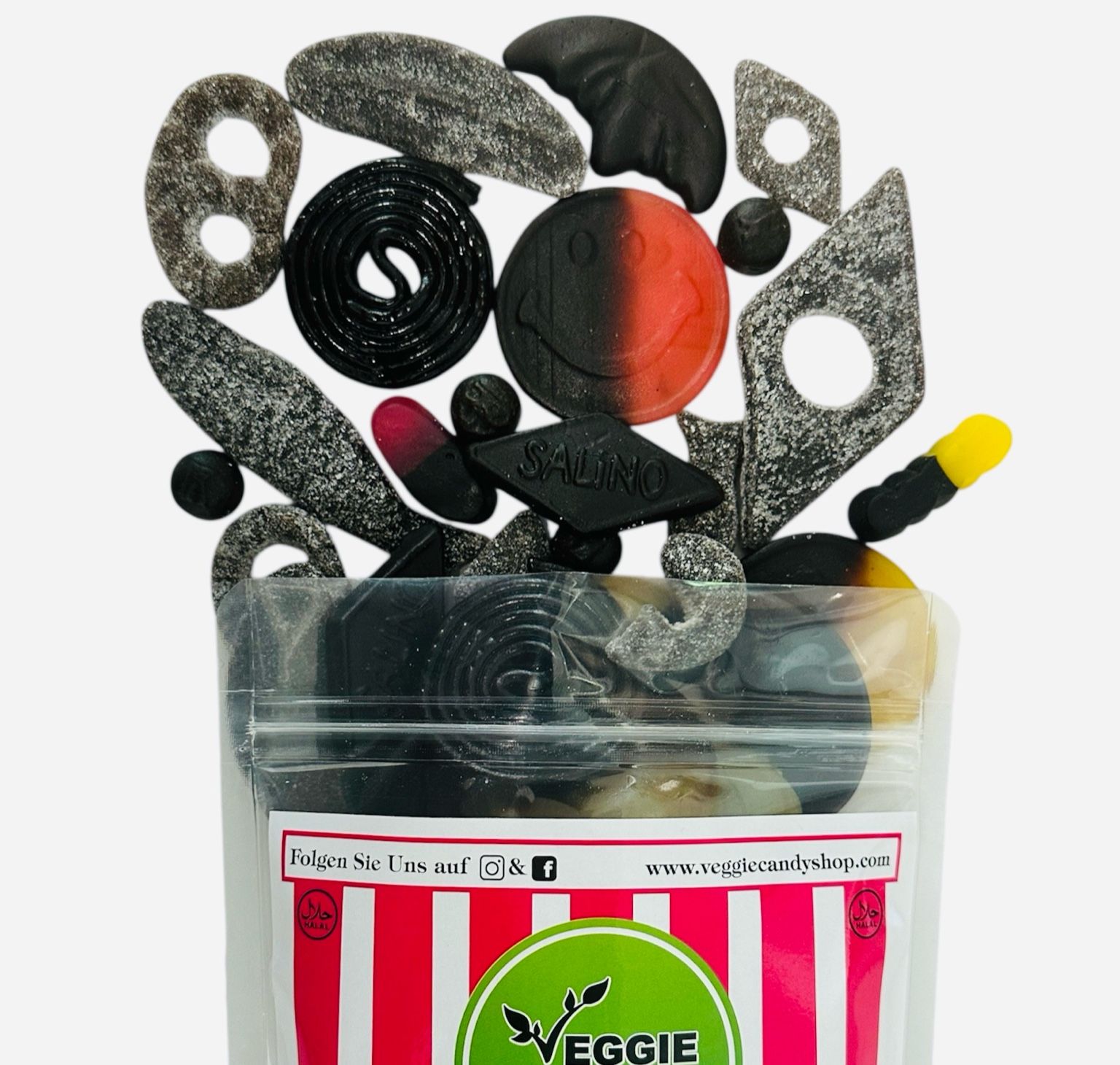 ZUTATEN : Glukosesirup, Zucker, Modifizierte Stärke (Weizen, Mais, Kartoffel), Säurungsmittel ( Zitronensäure), Süßholz Wurzel-Extrakt, Salmiaksalz, Farbstoffe (Kurkuma Farbstoff, Paprikaextrakt, Pflanzenkohle), Farbe aus Konzentrat (Schwarze Karotte), Natürliche Aromen, Pflanzenöl (Kokos), Überzugsmitteln (Bienenwachs weiß und gelb, Karnaubawachs).Enthält Gluten.