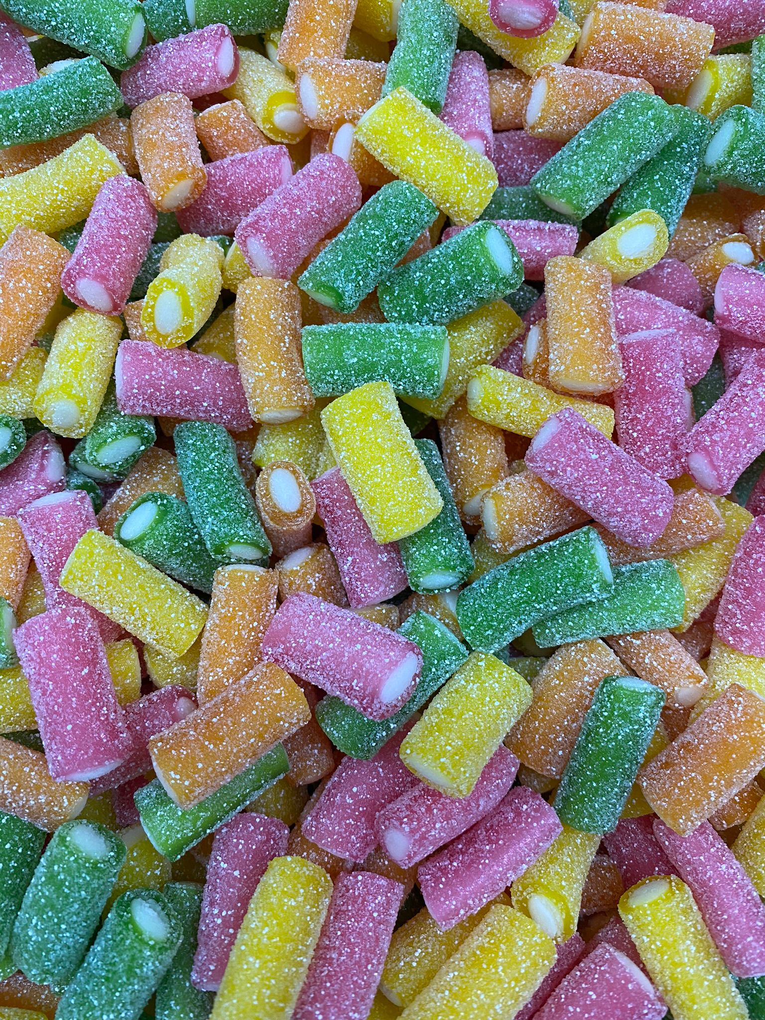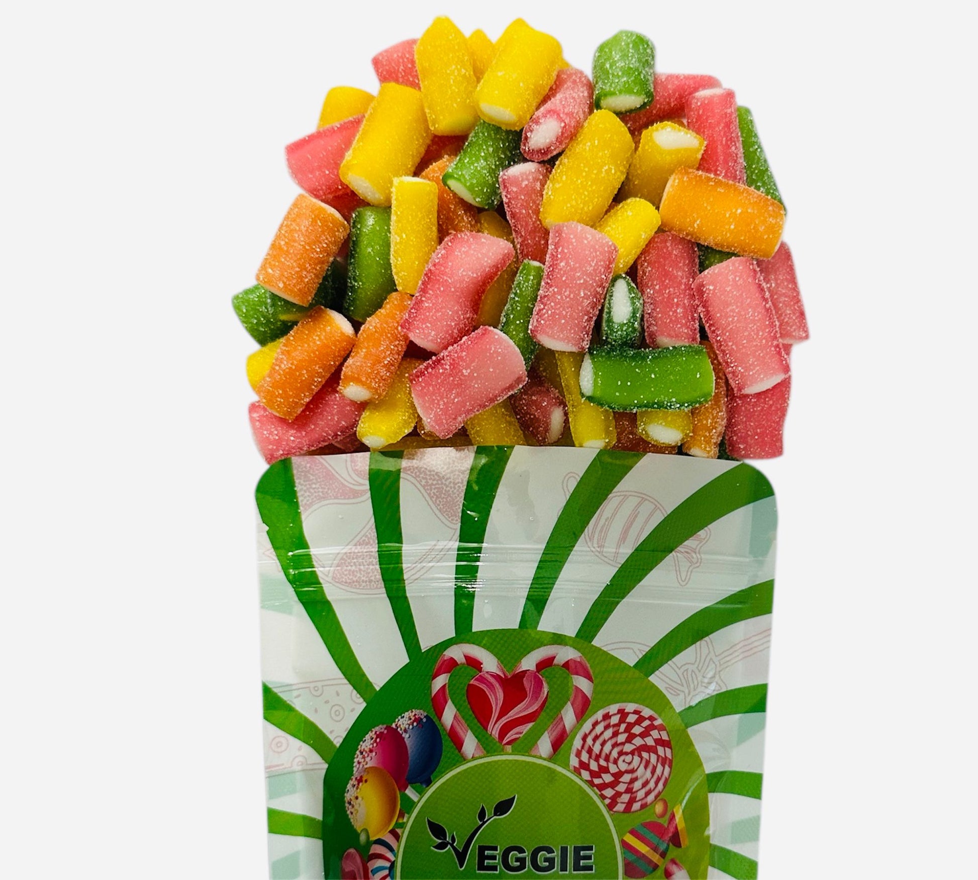 Zutaten: Zucker; Glukosesirup; Stärke; Feuchthaltemittel: Sorbitsirup, Sorbit; Säuerungsmittel: Citronensäure, Äpfelsäure; Säureregulatoren: Natriumhydrogenmalat, Tricalciumcitrat, Trinatriumcitrat; Überzugsmittel: Karnaubawachs; WEIZENMEHL; WEIZENSTÄRKE; Dextrose; Palmfett; Emulgatoren: Mono- und Diglyceride von Speisefettsäuren, Citronensäureester von Mono- und Diglyceriden von Speisefettsäuren; Geliermittel: Carrageen; Aroma; Frucht- und Pflanzenkonzentrate: Spirulin, Süßkartoffel, Apfel, Rettich, Schwarze Johannisbeere, Holunderbeere, Aronia, Traube; Holunderbeerextrakt; Farbstoff: Kurkumin. Kann Spuren von Milch enthalten.