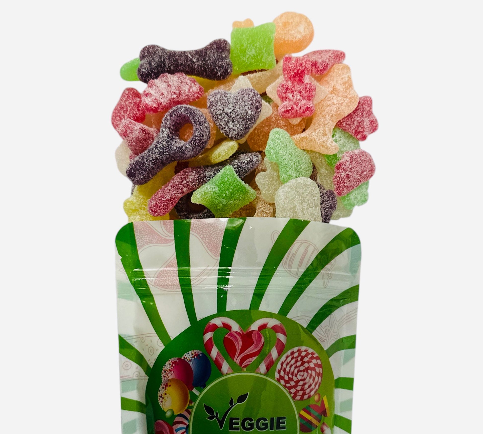 Zutaten: Zucker; Glukosesirup; modifizierte Stärke; Säuerungsmittel: Citronensäure, Milchsäure; Säureregulatoren: Calciumcitrate, Natriumcitrate; Aroma; färbende Lebensmittel (Schwarze Johannisbeere, Karotte, Curcuma, Rettich, Saflor); Farbstoff: Brillantblau FCF.