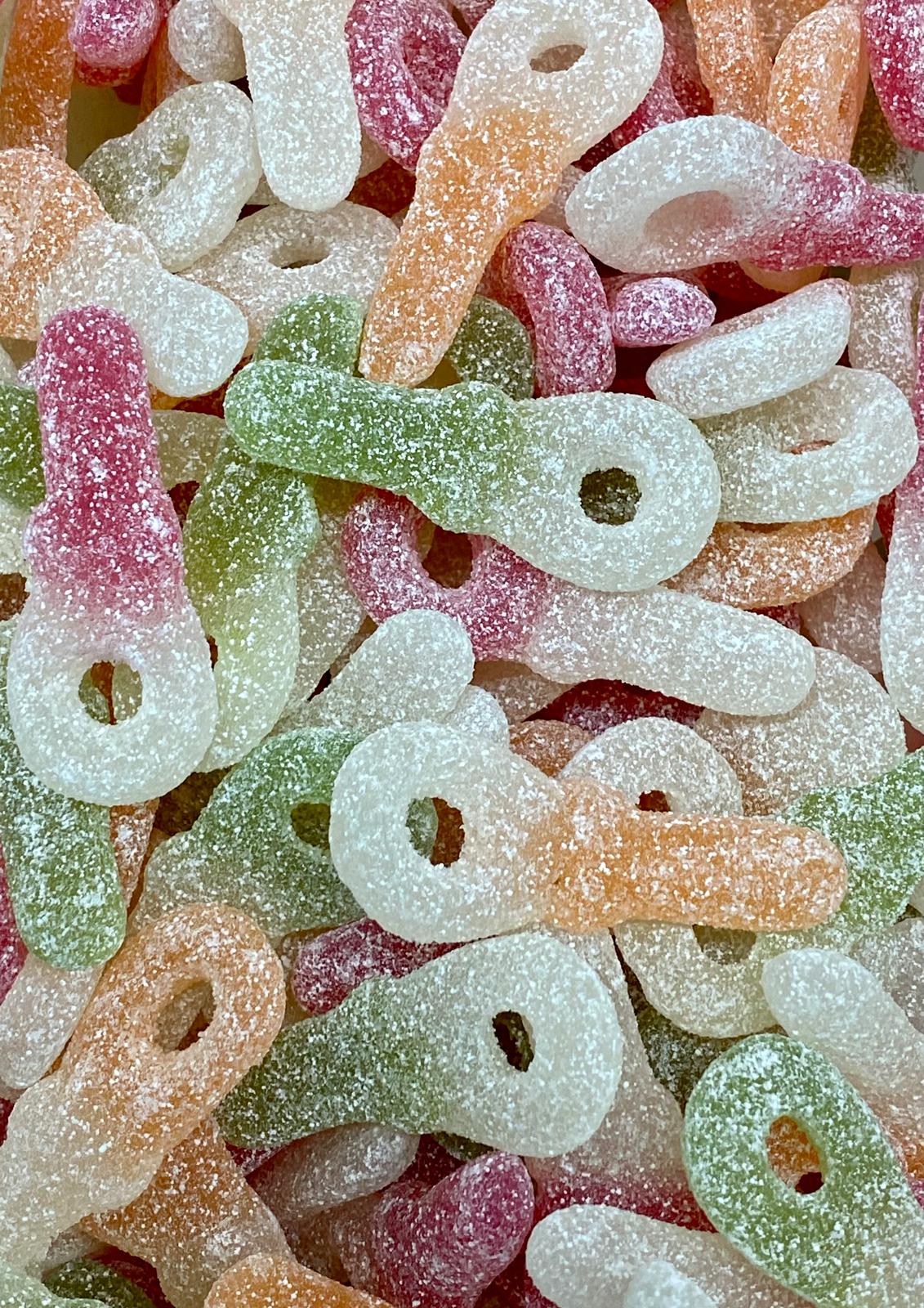 Zutaten: Zucker, Glukosesirup, Weizenstärke, Wasser, modifizierte Maisstärke, Säurungsmittel: E270, E296, E330, E350, Modifizierte Kartoffelstärke, Aromen, Lebensmittelfarbe (Konzentrate von: Spirulina, Saflor, schwarze Karotte Saft), Farbstoff:E160c Enthält Gluten.